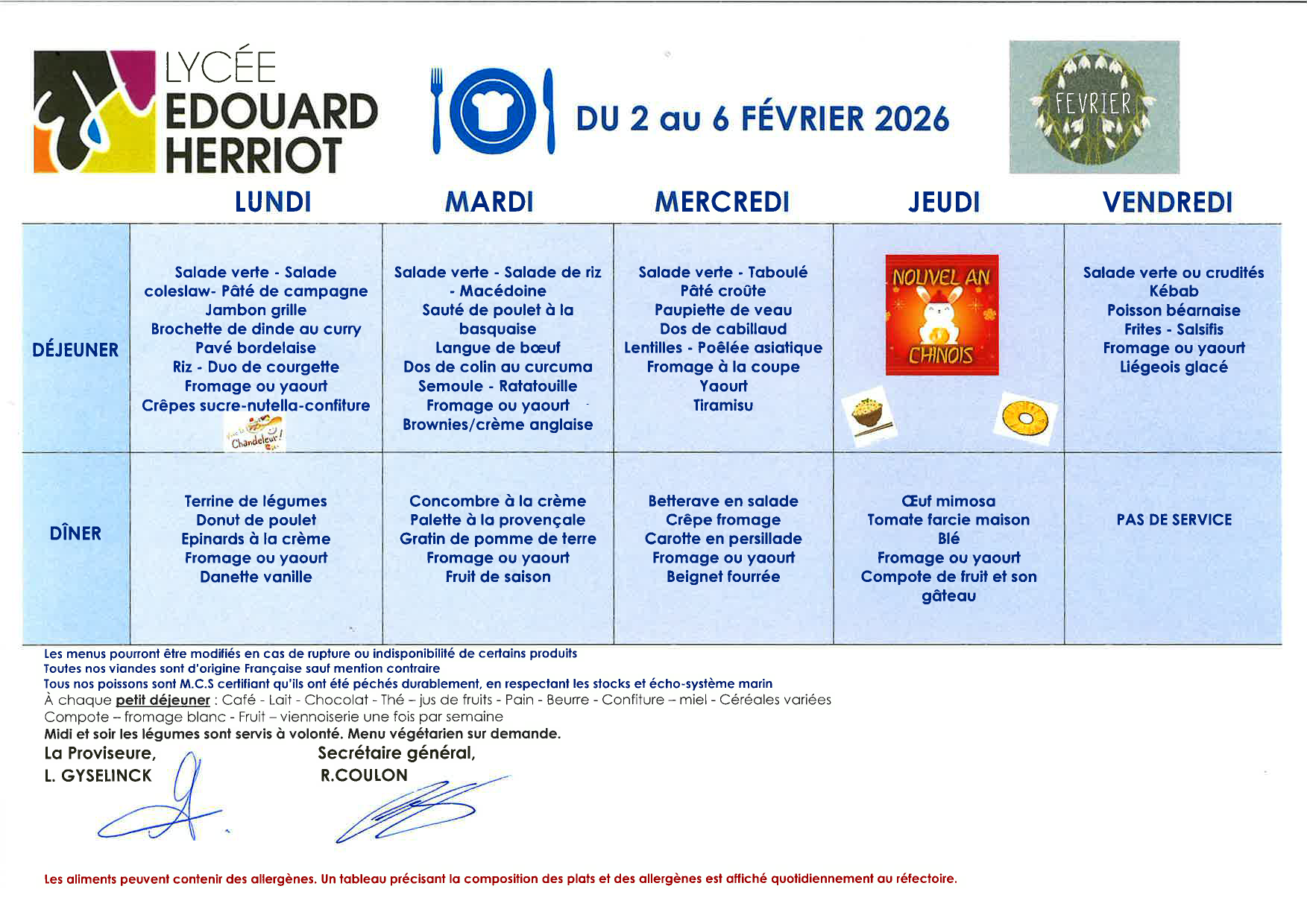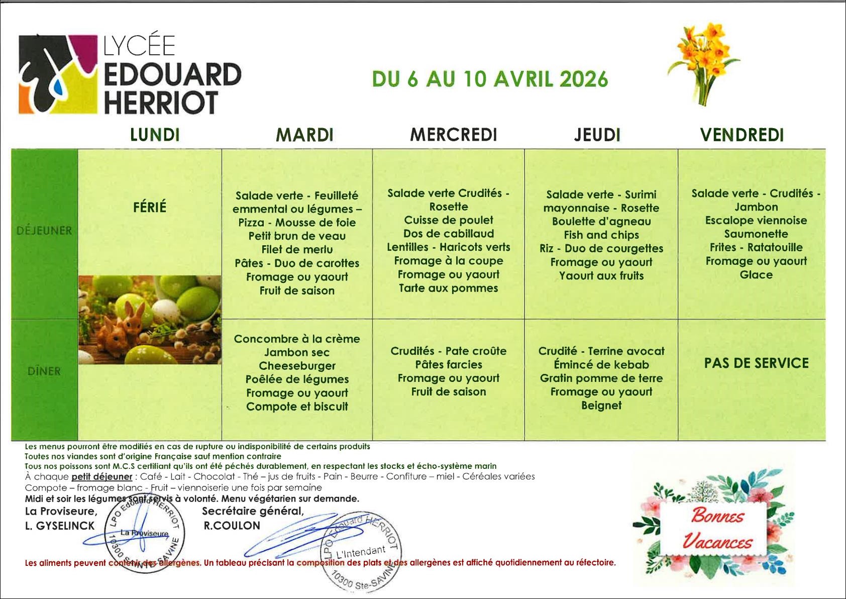 La production présente dans ces menus contient des allergènes. Pour plus d’informations, ne pas hésiter à consulter les cuisiniers.