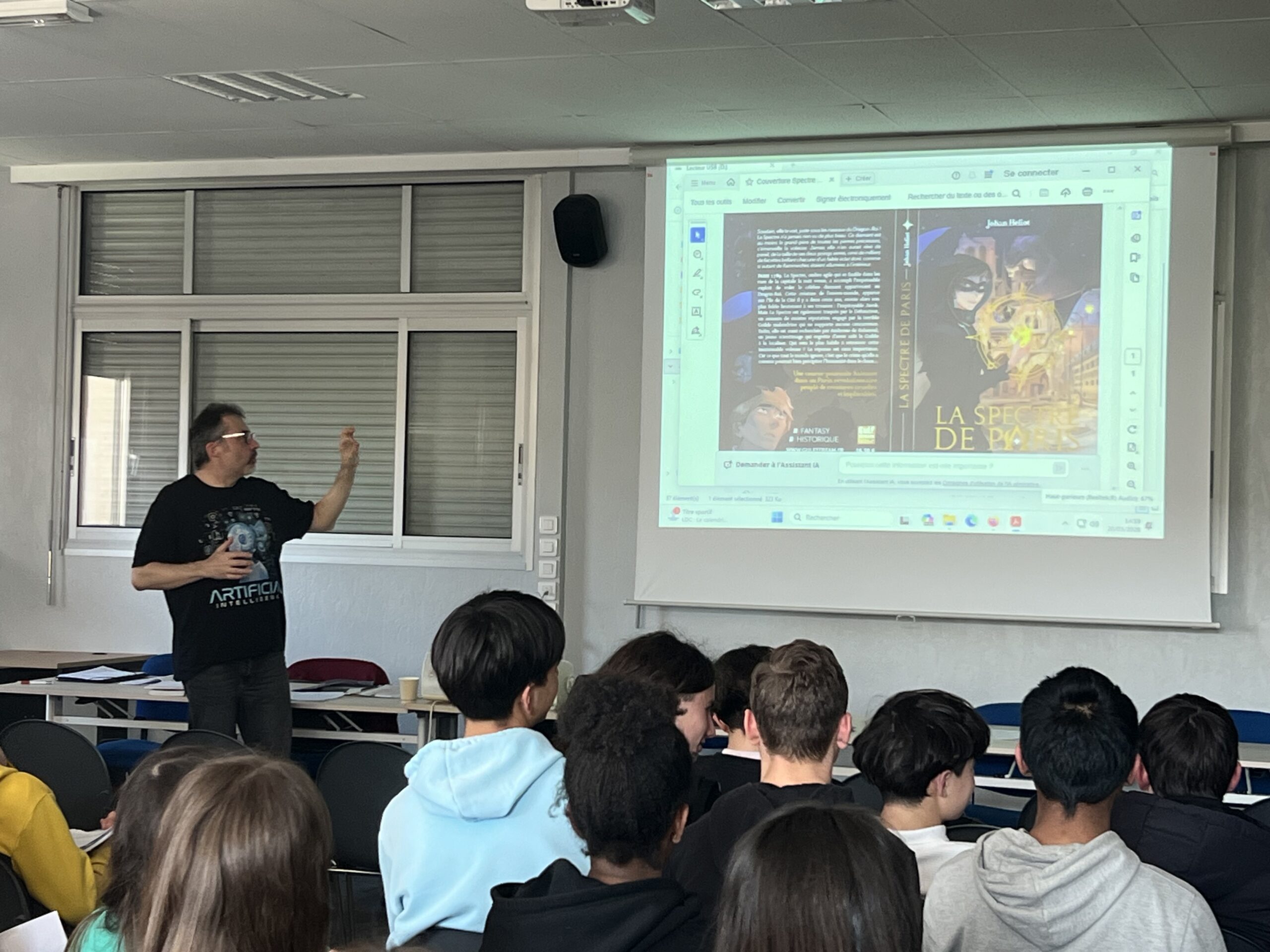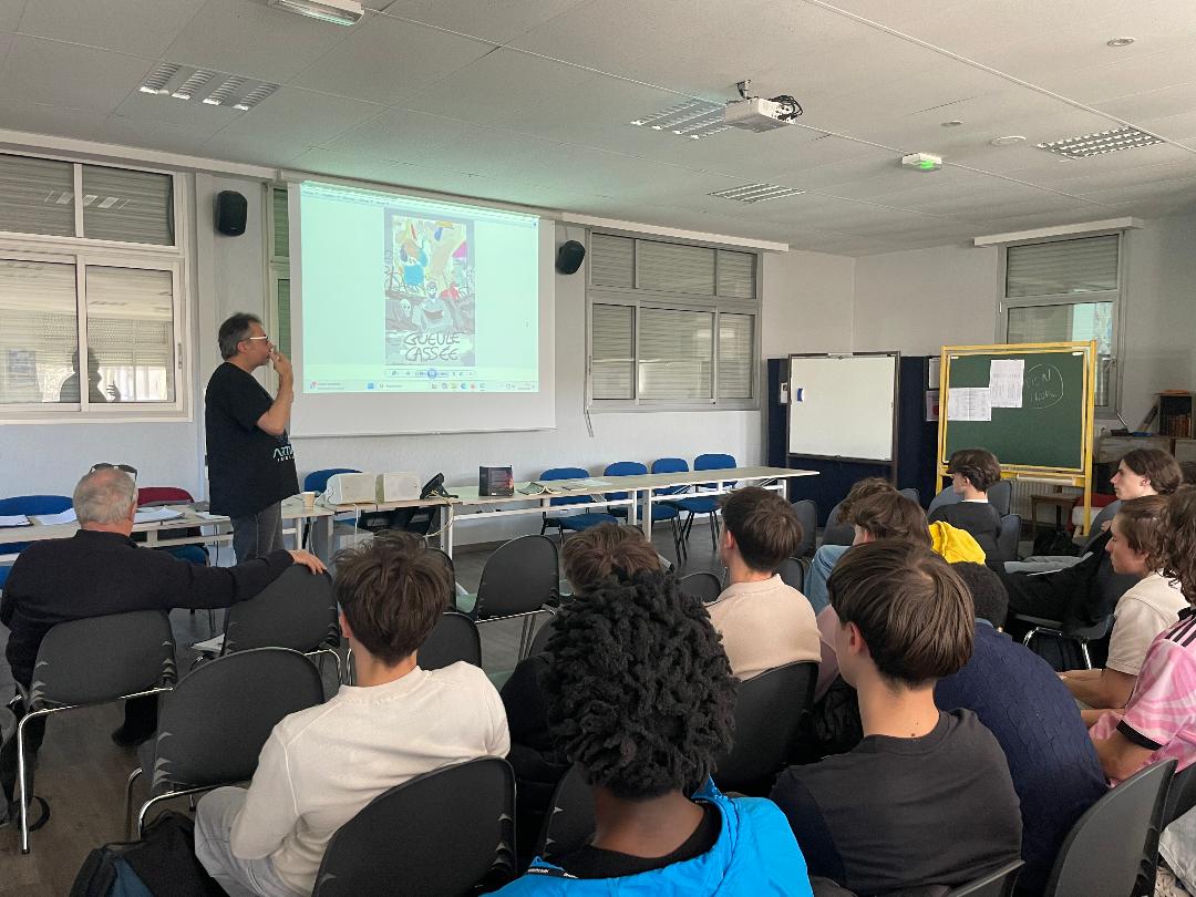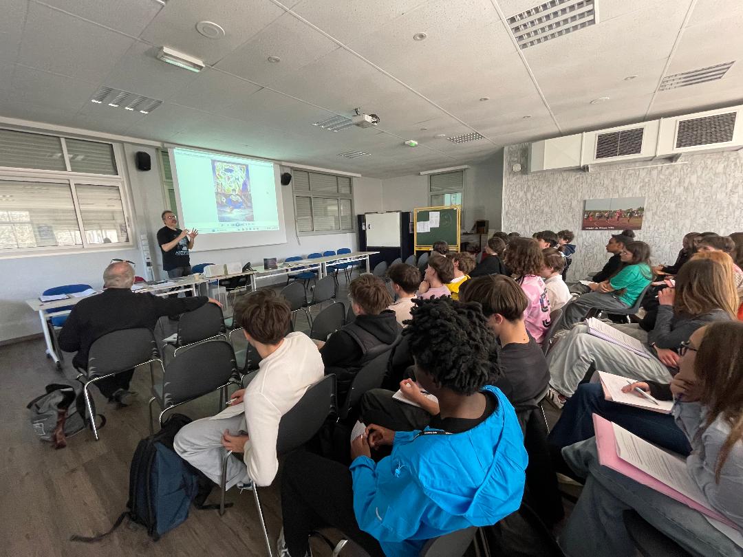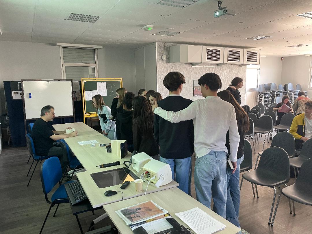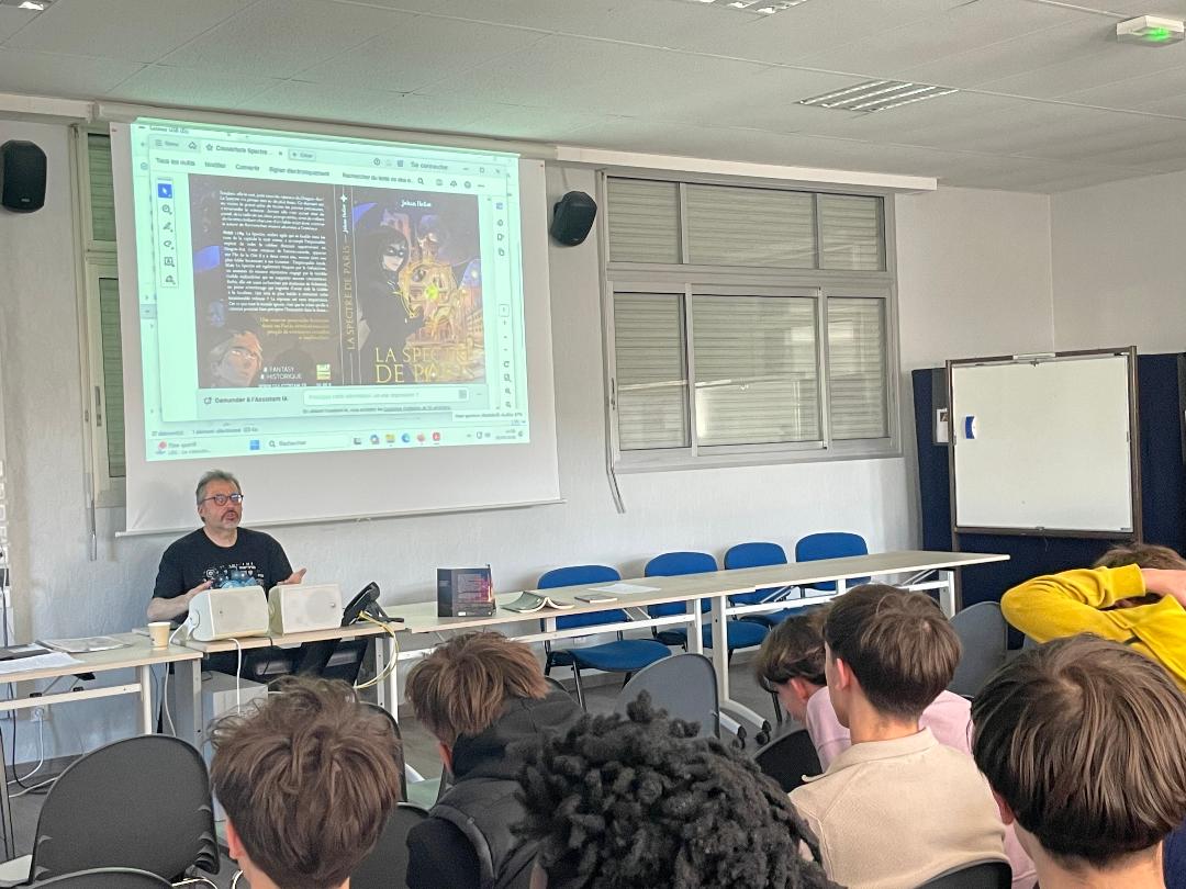 Déroulement : L’auteur s’est prêté à un jeu de questions – réponses avec nous. Cela a pu porter notamment sur ses sources d’inspiration, l’élaboration d’un roman, la démarche avec l’éditeur, un débat sur les nouvelles technologies. Puis il a vidéoprojeté des couvertures de ses romans pour problématiser le rapport entre l’image et le texte. Enfin, il a dédicacé nos livres , le tout sous l’œil avisé d’un journaliste venu exprès pour cette rencontre, encadrée par nos professeurs Mesdames Sabrina Mieur et Laétitia Lagarde, ainsi que la documentaliste Mme Audrey Delaunay.